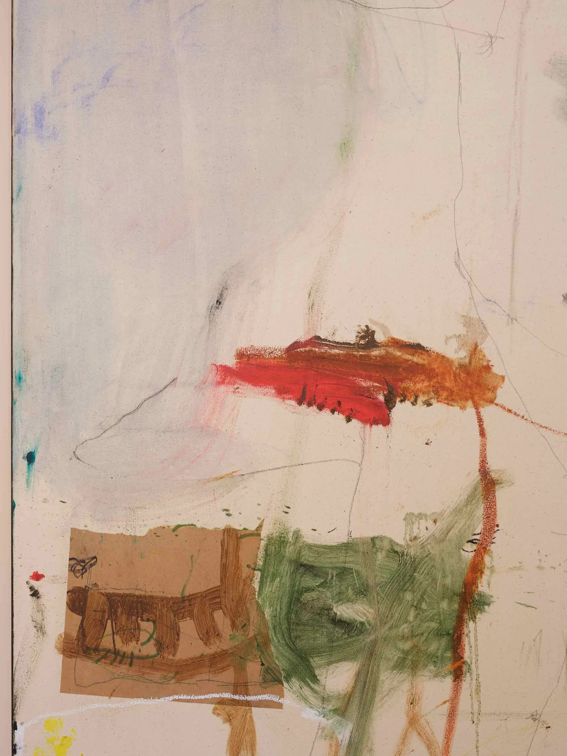 Conversation with puddle of oil, 2025 (detail) Oil, collage, pencil on canvas 1600 x 1300